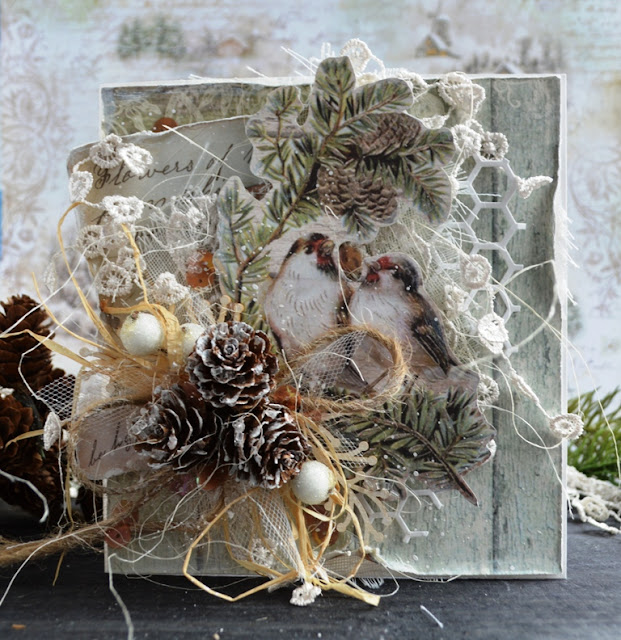 "Нужно Новому году готовиться..." - подумала Ягуся и достала свое волшебное лукошко. Не долго думая, вынула из него еловые шишки, кружево, игрушку ёлочную (чипборд деревянный). А еще взяла тряпочек и веточек разных. Состряпала Ягуся открытку мяконькую... но чего-то не хватает? Пошукала в лукошке и достала краску акриловую белую - пара взмахов кистью, и красота )))