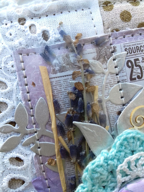 Из обязательных элементов использовала шитье, сухоцветы, песок и бумажные цветочки.